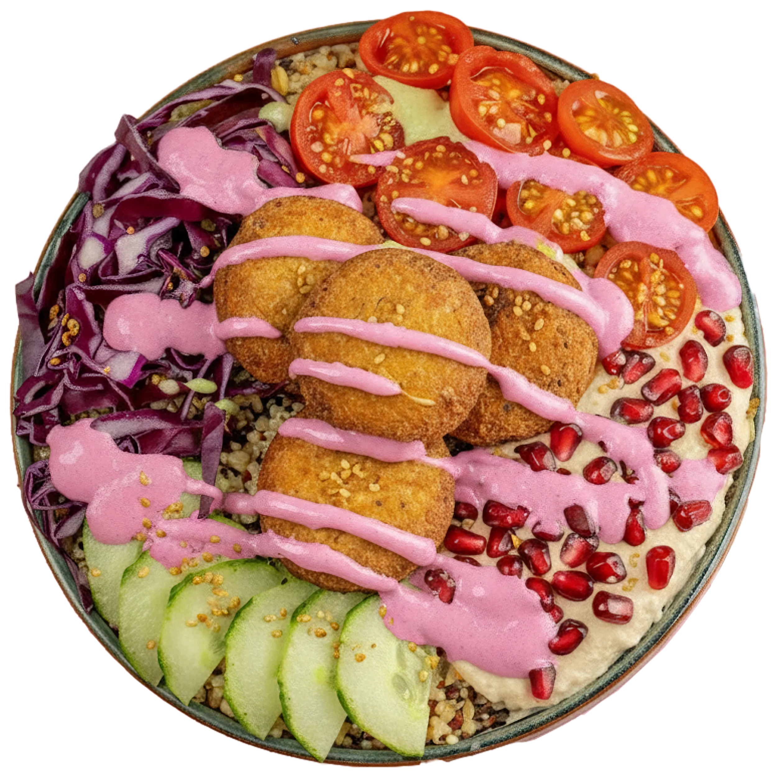 Quinoa-Bulgur Mix, Tahini, hausgemachte Falafel, Humus, Granatapfel, Gurke, Cherrytomaten, Rotkraut, Pink Power Kraut , Sesam seeds